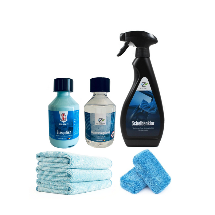 nextzett Glass Polish is a powerful glass cleaning polish that removes bug splatter, road grime, watermarks, hard water minerals, silicone, waxes, oils, and polyurethane adhesive residue. Use before applying a rain repellent such as nextzett Glass Sealant for best adhesion.