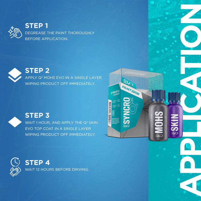 Q² SYNCRO EVO is the most advanced multi-layer ceramic paint coating ever produced by GYEON that is available on the open market. The ceramic coating kit combines the all-new Q² MOHS EVO with an all-new Q² SKIN EVO top coat. This ceramic coating is designed for maximum durability and protection out of the base coatings while delivering incredible gloss and color enhancement out of the topcoat with incredible durability of the self-cleaning and hydrophobic effects.