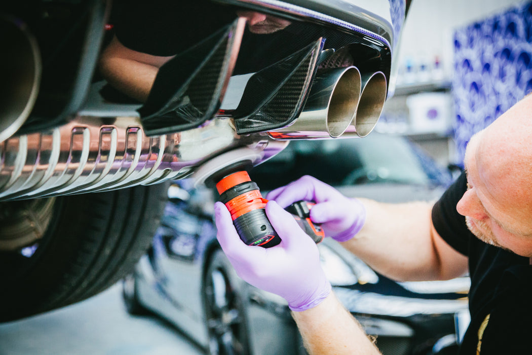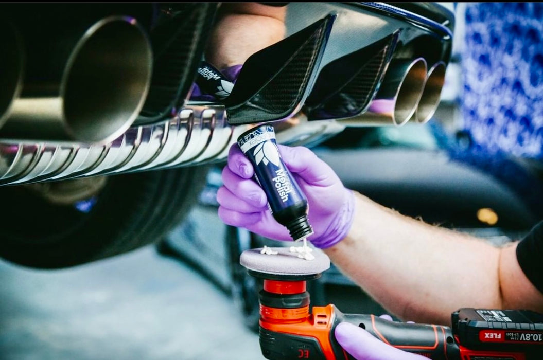 Spread a few pea-sized drops of Nanolex Metal Polish on a microfiber cloth/pad or a hard foam pad and keep spreading the polish by hand or machine until it becomes transparent and almost dry. Buff residue with a Nanolex Allround microfiber cloth.